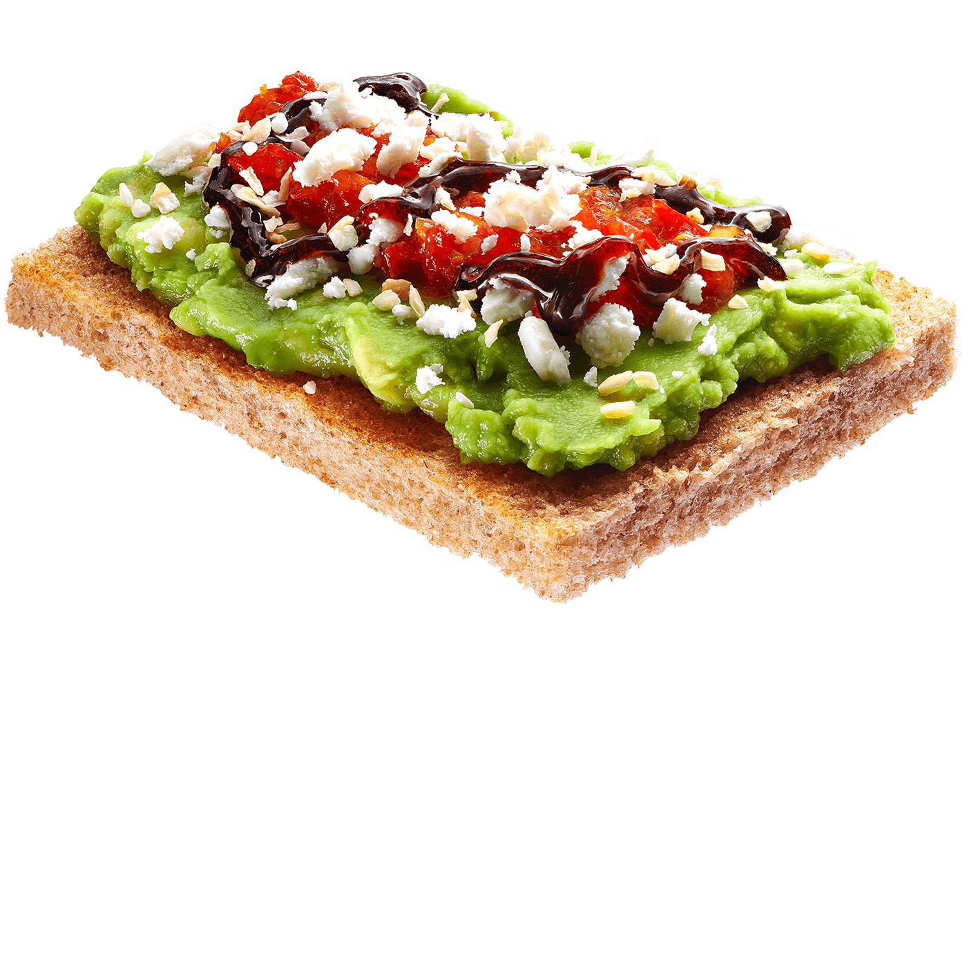 Avocado, pepper relish, and feta on crisp whole grain toast — finished with balsamic and everything bagel seasoning (sesame seeds, dried minced garlic and onion, salt, poppy seeds).