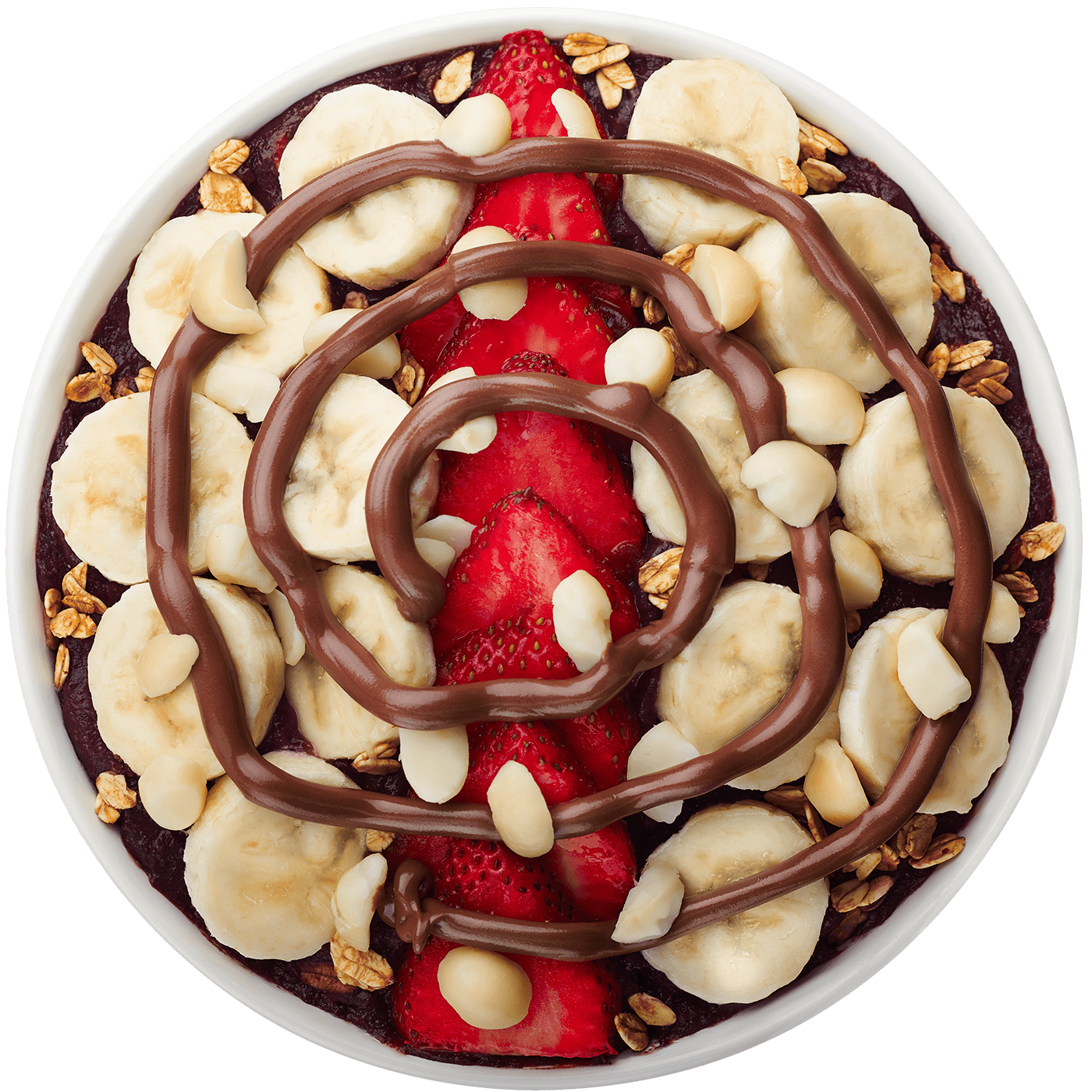 Organic, fair trade açai topped with strawberry, banana, granola, macadamia nuts, and Nutella drizzle — pure, decadent bliss.