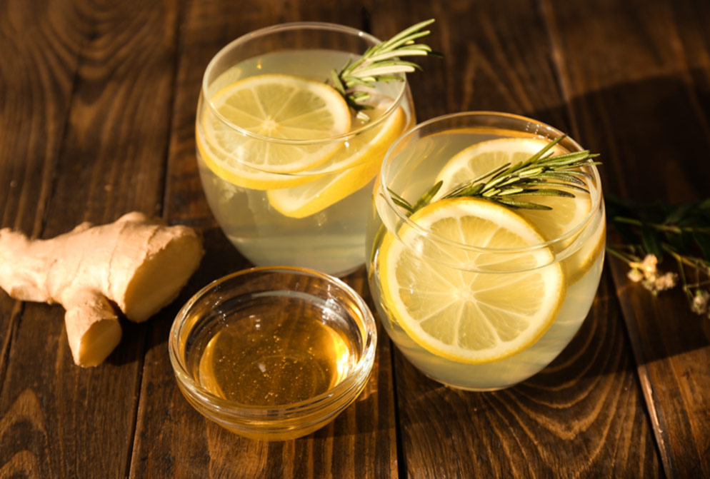 - Fresh ginger, pear juice, sparkling water, honey, lemon juice, ice.